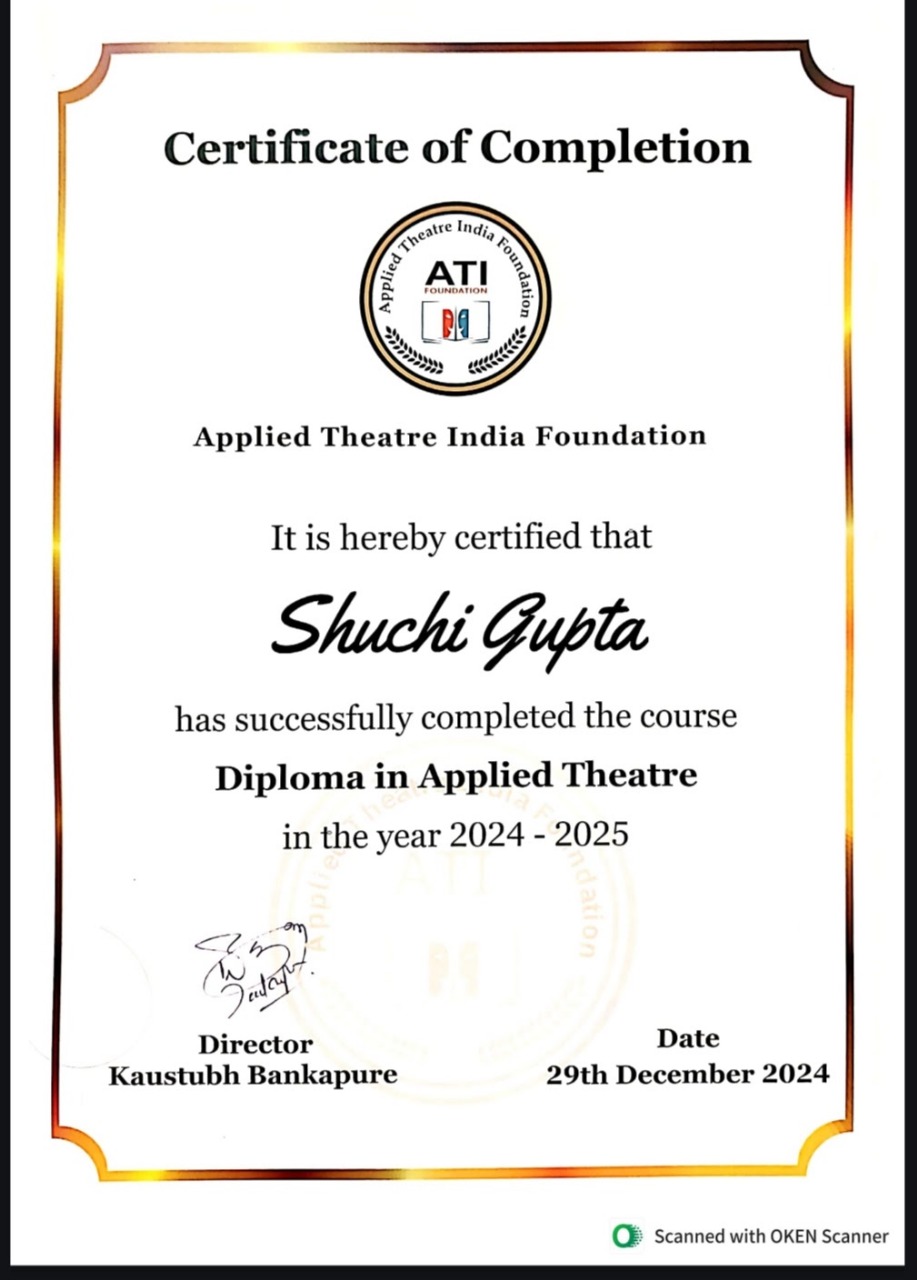 Shuchi currently serves as a Theatre Educator at Amity International School, Mohali, and works extensively across Chandigarh's tricity region with leading academic institutions as a theatre director, drama instructor, and communication skills specialist. Over the span of her career, she has directed and facilitated more than 25 theatrical productions.